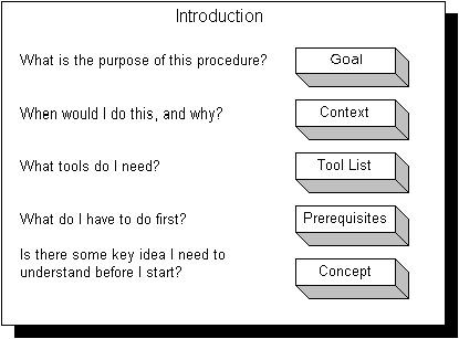 Intros are optionalAmericans don't like introductions, but the French do, and many Japanese insist on them. To accommodate personal and national tastes, you may need to make any introduction into a distinct object, so it can be removed or included during customization, localization, and personalization. An introduction may be justified if you think the user may have questions about the subject of the procedure, or the preparations needed. As you explore your audience's skills, knowledge, attitudes, expectations, problems, and goals, you may come to see that certain questions come up fairly often, as people get ready to perform an action. Those throat-clearing questions demand particular components in your introduction.