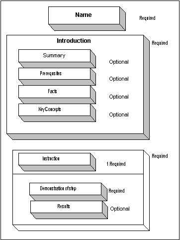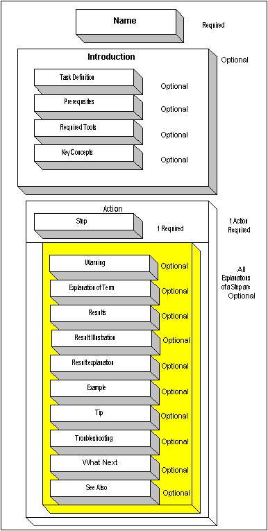 Full object model of a procedureHere's a diagram of a thorough-going pattern for a procedure. Probably more than you need. So you might start here, and throw out unnecessary components. Of course, at that point, you might decide: Now I need to add some other elements! So this pattern is not universal. It's just a pattern that I have found useful in a lot of circumstances, when trying to sort out legacy documents, or craft procedures out of a tangled mess of notes left by several generations of writers, each annotating the other. The corporations that seem to need something as complex as the full model are companies that produce huge, complex products, often integrating subcomponents from half a dozen or more other manufacturers, resulting in inconsistency, redundant features, special twists and turns, ambushes, and deadends. In those circumstances, you have a lot to introduce, and plenty to explain. I hope you don't have to write procedures in that environment. If you're describing easier tasks, you'll want to pick and choose components, creating a model that works for your audiences. Let us know what you come up with. (You'll see some folks' variations after the uber-diagram). |