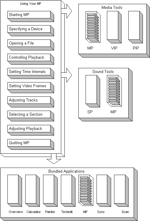A group of procedures can be a reusable objectIf you find you are writing hundreds of procedures, or your team is churning out a few thousand, you begin to notice that you keep repeating yourself. You need to refer to, or reprint whole sets of procedures. Back in the days when we wrote books, we would put those procedures in their own chapter, and then, whenever we needed to have people do those, we would say, "Go see Chapter 5 for info on how to do this!" Online, we can invoke the set of procedures electronically, so, in effect, we can repeat ourselves ad infinitum. If you need to invoke a certain group of procedures over and over, create a new element that points to all of those procedures. That's a reusable object. Example: When telling people how to use your MP3 player, you may discover that you keep referring to a series of procedures called Using Your MP. You need to point to those procedures in your sections on Media Tools, Sound Tools, and Bundled Applications. Here's how you might diagram the reuse. |