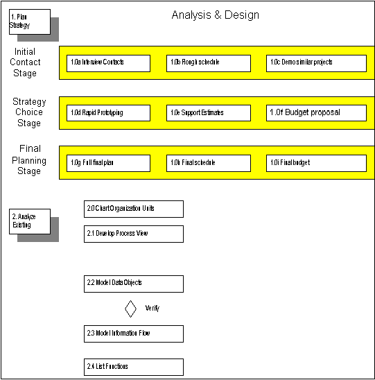 Build a process as a sequence of procedures.A process is a way of doing things, so you can often build it out of a series of procedures that must be done in a particular order. Use a table of stages, or a flow chart, to demonstrate the sequence of procedures within the process. If there are places where a person can one way or another, use a chart with a decision point. If the procedures are done by different people, follow playscript format, indicating who does what in a parallel column, as in policies and procedures manuals. A process, then, grows out of a series of actions and decisions. On the ground floor, you have a series of procedures. Caution: Do not call a procedure a step. Sure, seen from high enough, an individual procedure is just one move forward in the process. But reserve the word "step" for a single meaningful action within a procedure. Recognize that you can build many levels of process out of procedures, and groups of procedures. Action can be viewed at many scales: at the lowest level, we look at a step. One level up, and we encounter an entire procedure. Then a group of procedures, which may be part of a process...and so on up the tower of Babel. Your pattern for processes must accommodate action at several levels, building up from simple actions like flipping a switch to broad strategic processes, such as analysis and design. |