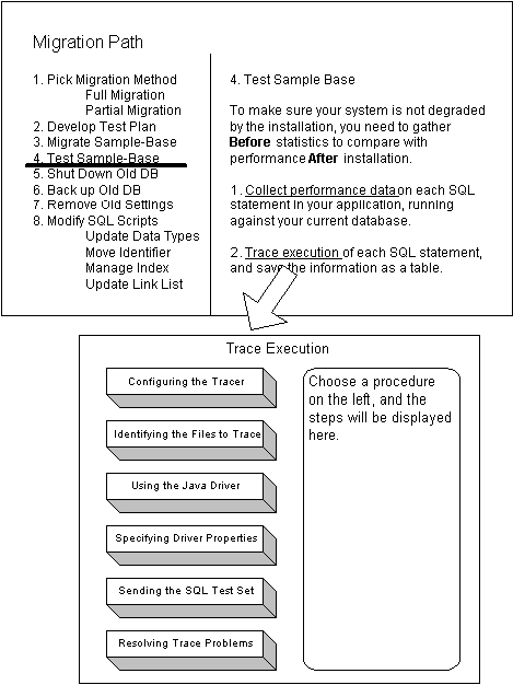 The process set called Migration Path includes 8 individual processes. When you click 4. Test Sample-Base, you see a brief description of that process, with links to two individual sets of procedures. When you click Trace Execution, you go to a page that shows that set of procedures. When you click one of those, you see the procedure on the right.